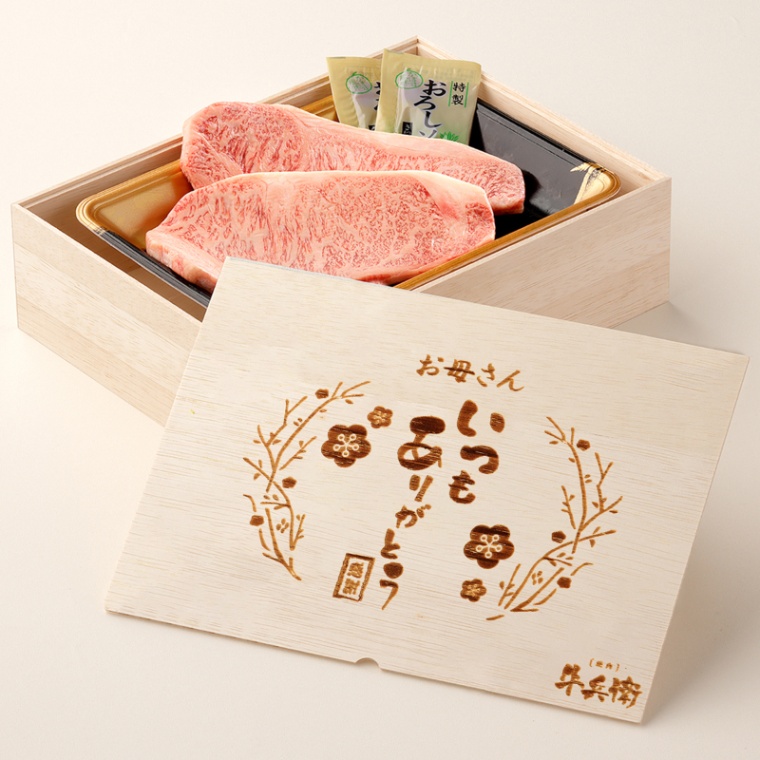 ・高級感溢れる牛兵衛オリジナルの木箱に風呂敷が巻かれて梱包されています。大切な人への贈り物にも、自分へのご褒美にもきっと喜んでもらえる様になっております。