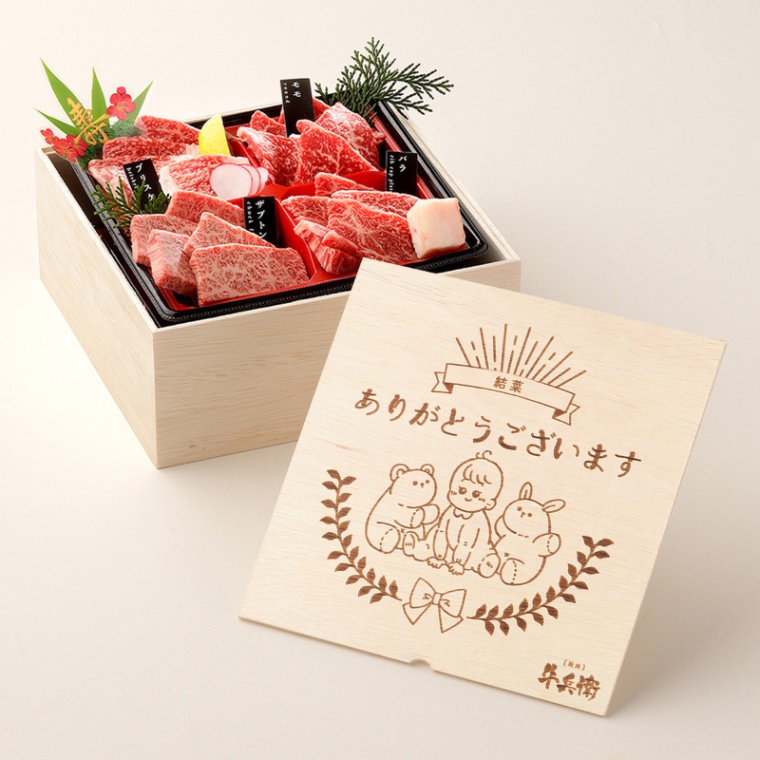 ・黒毛和牛国産牛の厳選詰め合わせ。お店で人気のあるお勧めの部位を、お肉のプロである店主が直々に厳選した至高のおせち。『焼肉』『すき焼き』異なる食べ方が楽しめる贅沢な2段重。また、お客様の想いを届ける大切な一品。ギフトにおススメなオリジナルの豪華な木箱にスリーブ(折箱)を入れた重厚感のある包装です。木箱はそのままギフト用としてご利用頂けます。